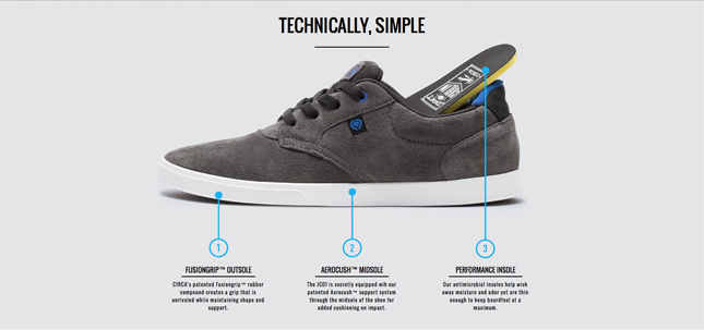 A sola Fusiongrip, patenteada pela C1RCA, garante a máxima aderência e ao mesmo tempo apoio ao pé. A tecnologia Aerocush garante-te protecção extra, ao amortecer o impacto. O JC01 está também equipado com uma palmilha anti-odor, que te ajuda manter os ténis secos, mas ao mesmo tempo com a espessura certa para poderes sentir o teu skate. Tecnologia, simples!