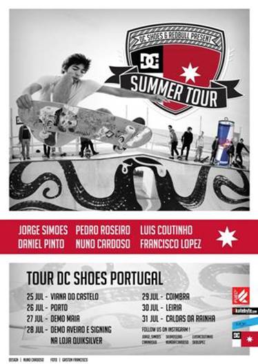 Já viste o Jorge Simões, Pedro Roseiro, Luis Coutinho, Daniel Pinto, Nuno Cardoso e Francisco Lopez a skatar ao vivo e a cores? Ainda não? Pois vais ter a tua oportunidade, basta estares atento às datas em que o tour de verão da DC vai passar perto da tua casa já a partir do próximo dia 25 de Julho. Vão ser 7 dias de skate non-stop com demos e sessão de autógrafos, se te portares bem ainda pode ser que leves para casa a assinatura de todos eles na testa…