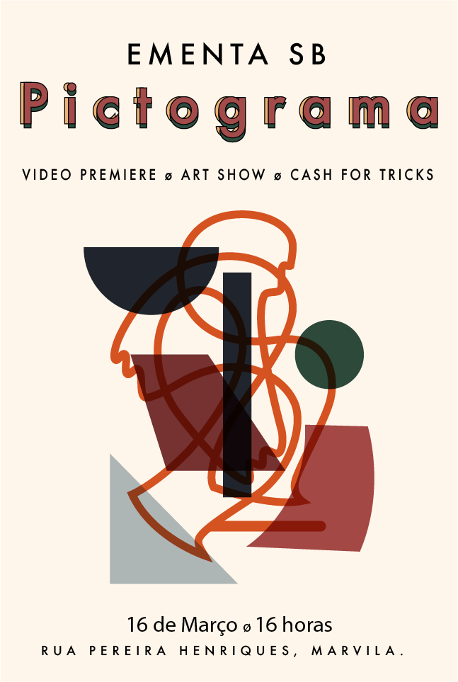 Este final de semana promete ser dos que nós gostamos mesmo, depois de na sexta-feira abrirmos o fim de semana com a estreia da nova vídeo-part do Gabriel Ribeiro logo no dia seguinte a Ementa SB apresenta Pictograma no armazém do Todos em  Marvila. O lançamento da nova colecção da marca de skate nacional vai contar com uma exposição, estreia de um filme da campanha e com um cash for tricks.  Por isso já sabes, é para aparecer e levar o skate, não te estragues logo na sexta à noite!
