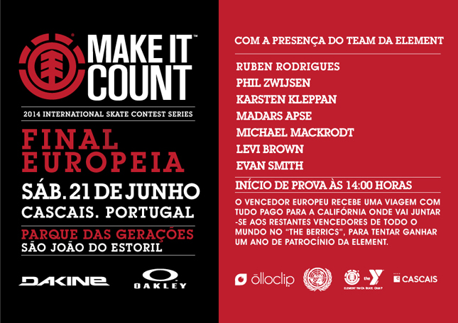 “No próximo dia 21 de junho, a final europeia do Element Make It Count – série de eventos internacional para skaters amadores – tem lugar, pela primeira vez, em Portugal, no Parque das Gerações, em S. João do Estoril. Esta final irá definir, entre os representantes dos vários países europeus, o representante da Europa na final mundial.