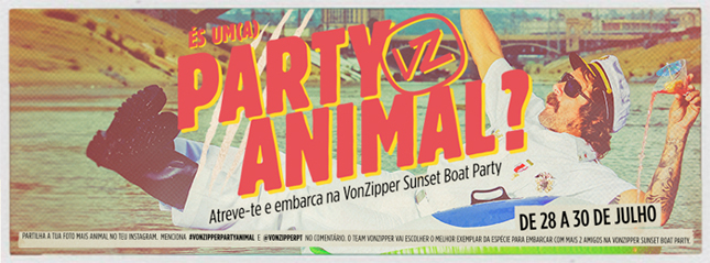 Partilha a tua foto mais animal no teu Instagram. Menciona #vonzipperpartyanimal e @vonzipperpt no comentário. O team VonZipper vai escolher o melhor exemplar da espécie para embarcar com mais 2 amigos na VonZipper Sunset Boat Party.”