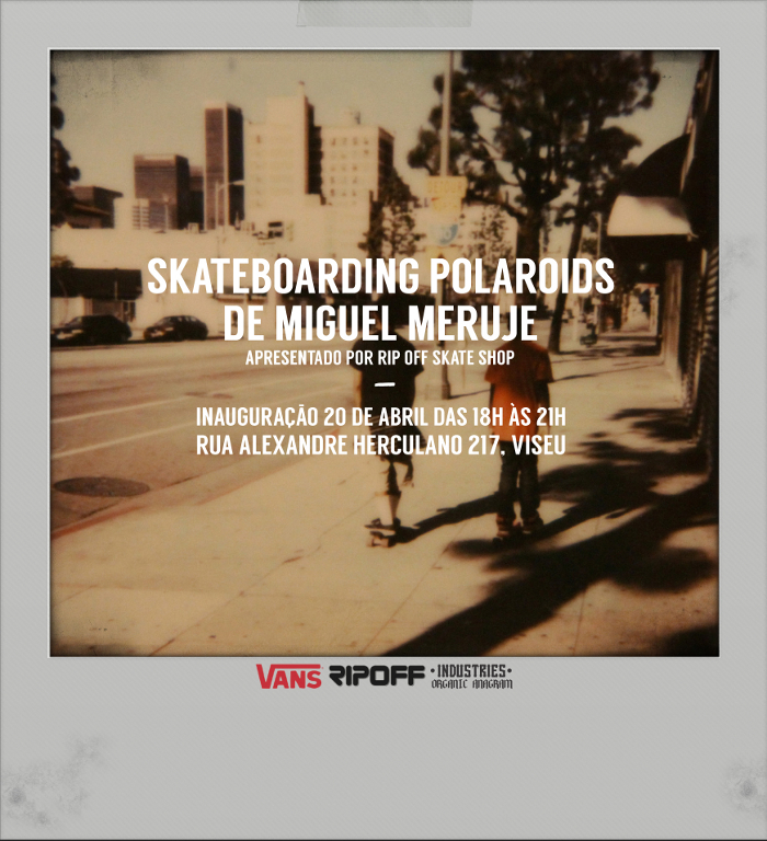 Coincidente com os 14 anos da loja de skate em Viseu, a Rip Off Skate Shop apresenta a primeira exposição a solo de Miguel Meruje. Como o nome indica, ‘Skateboarding Polaroids’ é composta por várias fotografias tiradas em ambas as costas dos Estados Unidos, de sítios emblemáticos da história do skate, mas também de anónimos e de figuras como Christian Hosoi, Eric Koston, Lance Mountain, Mike Carroll, David Gonzalez, Antwuan Dixon, entre muitos outros.