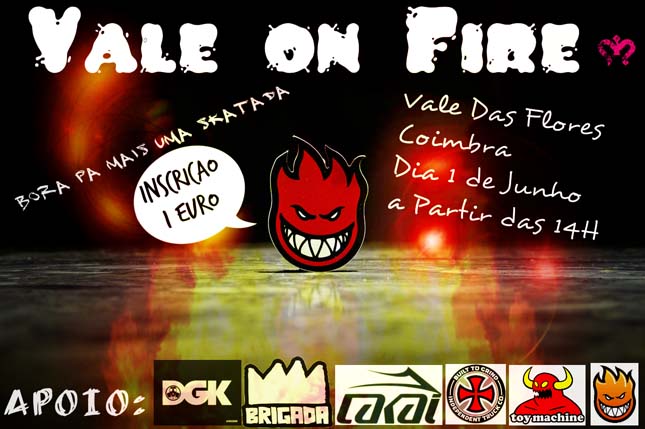 Vale On Fire: Coimbra, 1 de Junho No dia da criança, o Vale das Flores, em Coimbra, vai “pegar fogo”! Há skatada, mas da séria, a partir das 14 horas. A inscrição vale 1 euro… Mais 26 anos de Manelsport. Parabéns! SURGE Vídeo Osiris em Portugal Ele Surge…João Amado Vídeo SURGE: final Red Bull Skate Arcade Barcelona